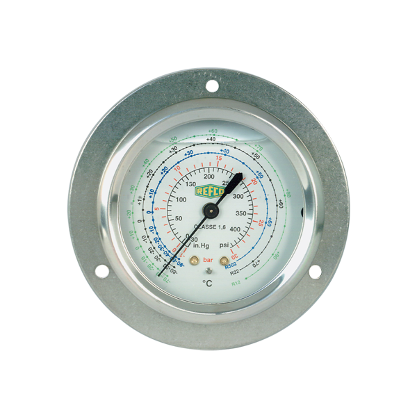 Bourdon Type Gauge, NS 63, 1/4″SAE backside Class 1.6, oil filled, with front ring, stainless, pressure scale: bar / psi, for R407C, R134a & R404A